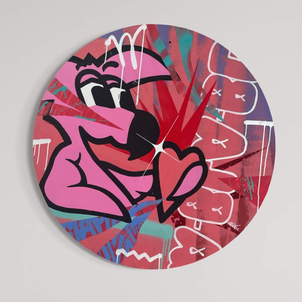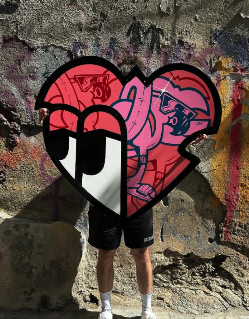 Retour Love & Chill Format 100 cm support Acier découpé TECHNIQUES UTILISÉES Aérosol, acrylique, vernis carrosserie année 2024